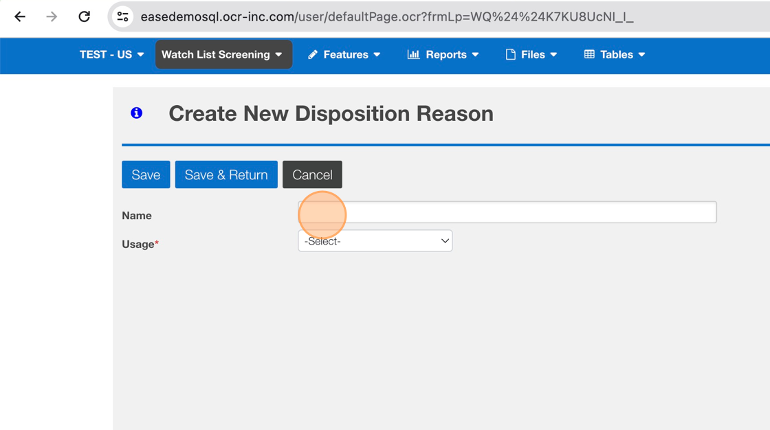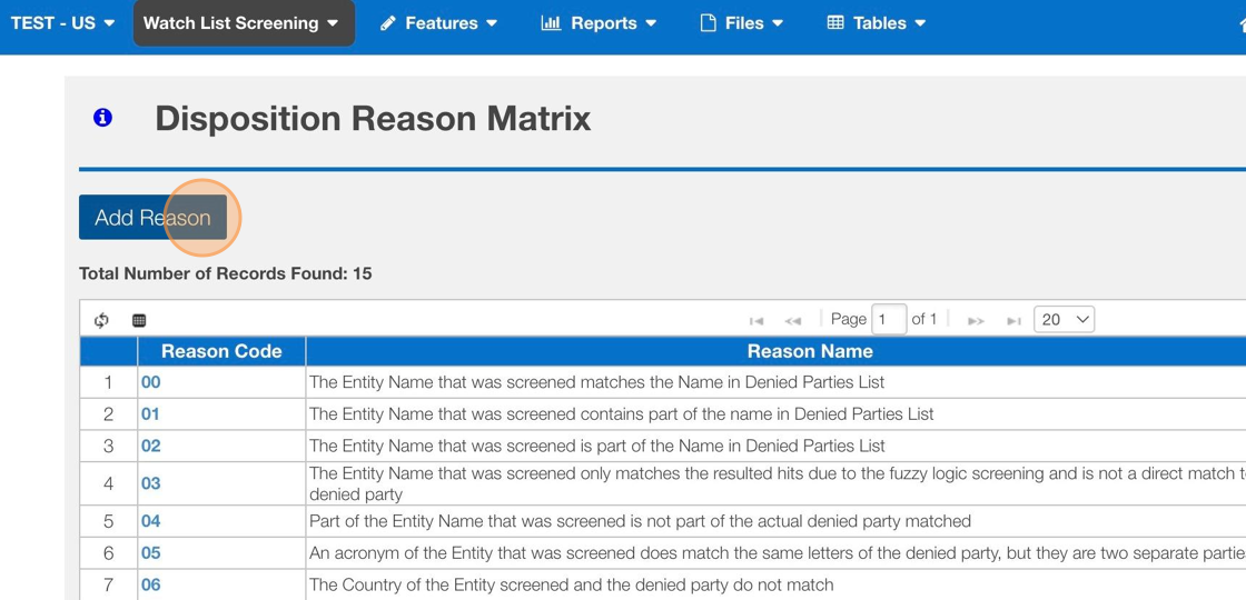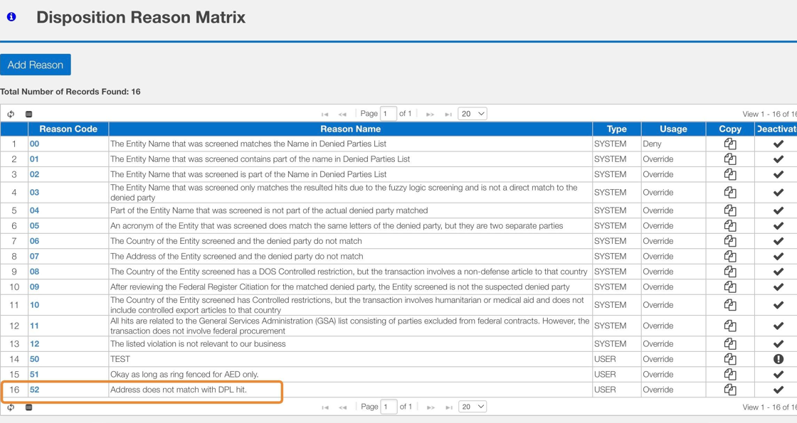 8. Your Reason will appear at the bottom of the Disposition Reason Matrix table.