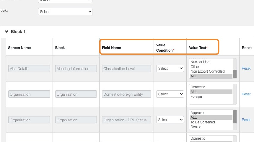 9. Using the table, set the "Value Condition" and "Value Text" for the corresponding Field Name based on your business requirements.