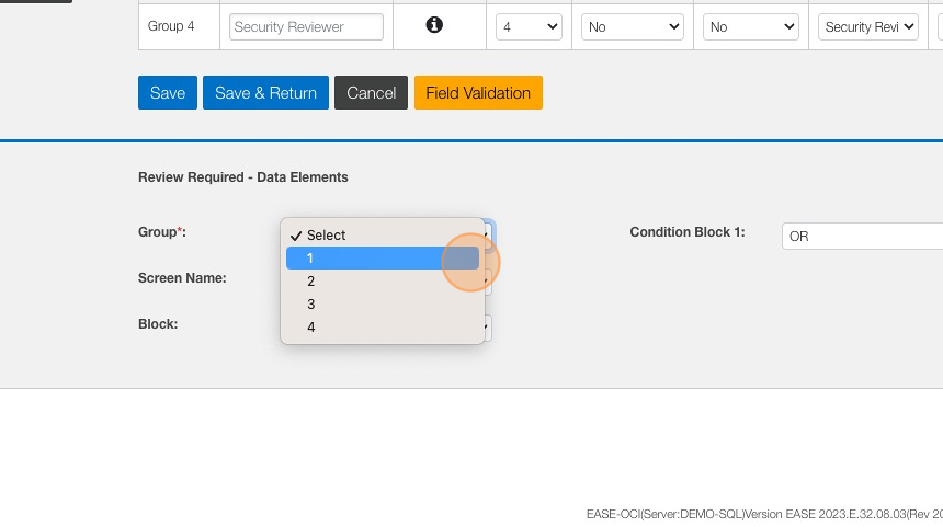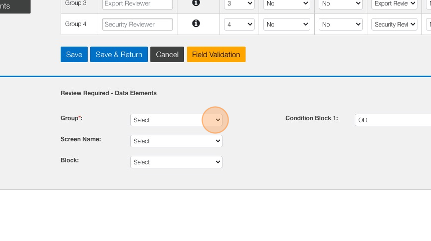 7. In the Review Required - Data Elements section, Click the "Group" drop-down.