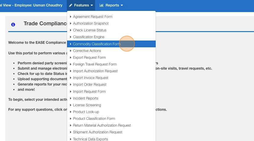 Steps: 1. Navigate to EASE 2. Click "Commodity Classification" 3. Click "Add New Classification Request" 4. Click the "Create New Classification Request" field. 5. Click "Select" 6. Enter the Request ID 7. Click "Save & Proceed" 8. Click "Save & ...