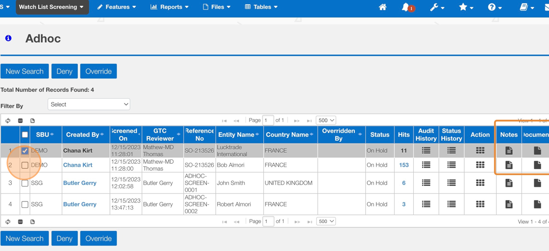 8. Use the multi-select check boxes to apply a deny/override to multiple records. Use the Notes and Document icons to add content or supporting audit information.
