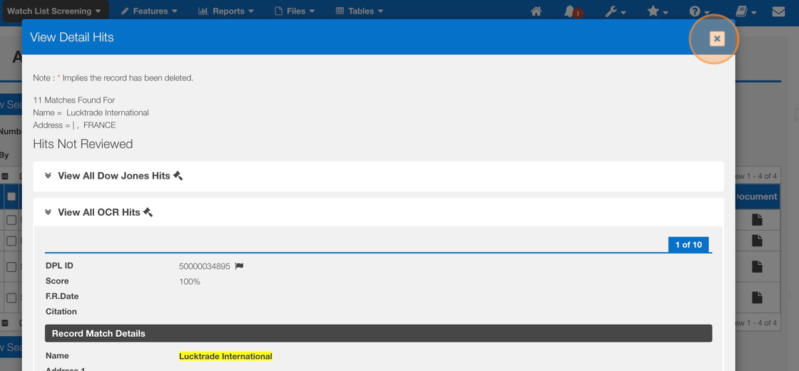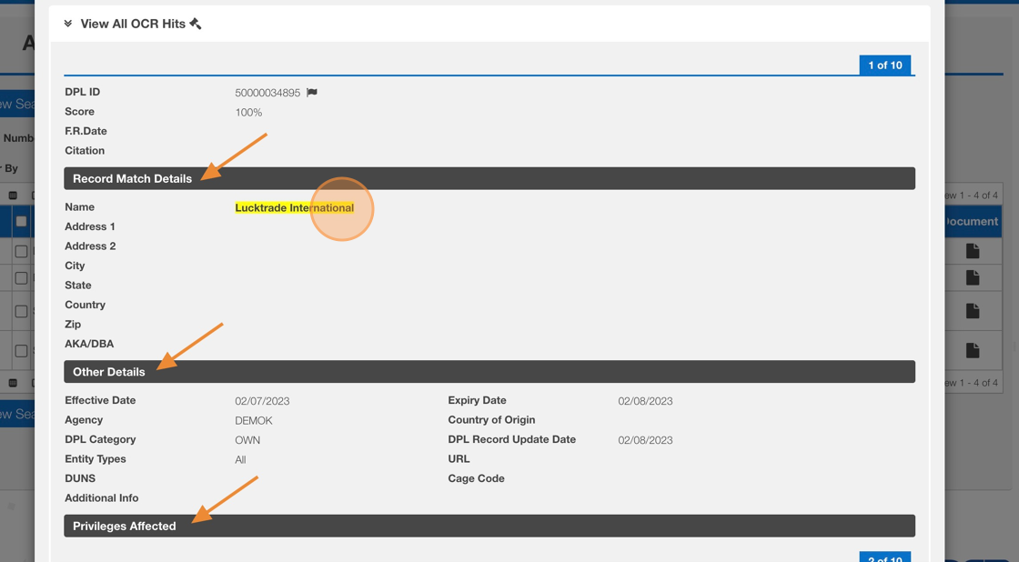 5. Review the different sections of the hits to assist with the deny / override decsion.
