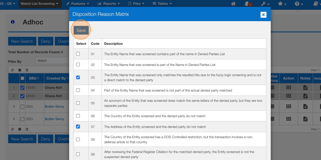 10. Use the Check Boxes to provide a Deny or Override reason. Click "Save"