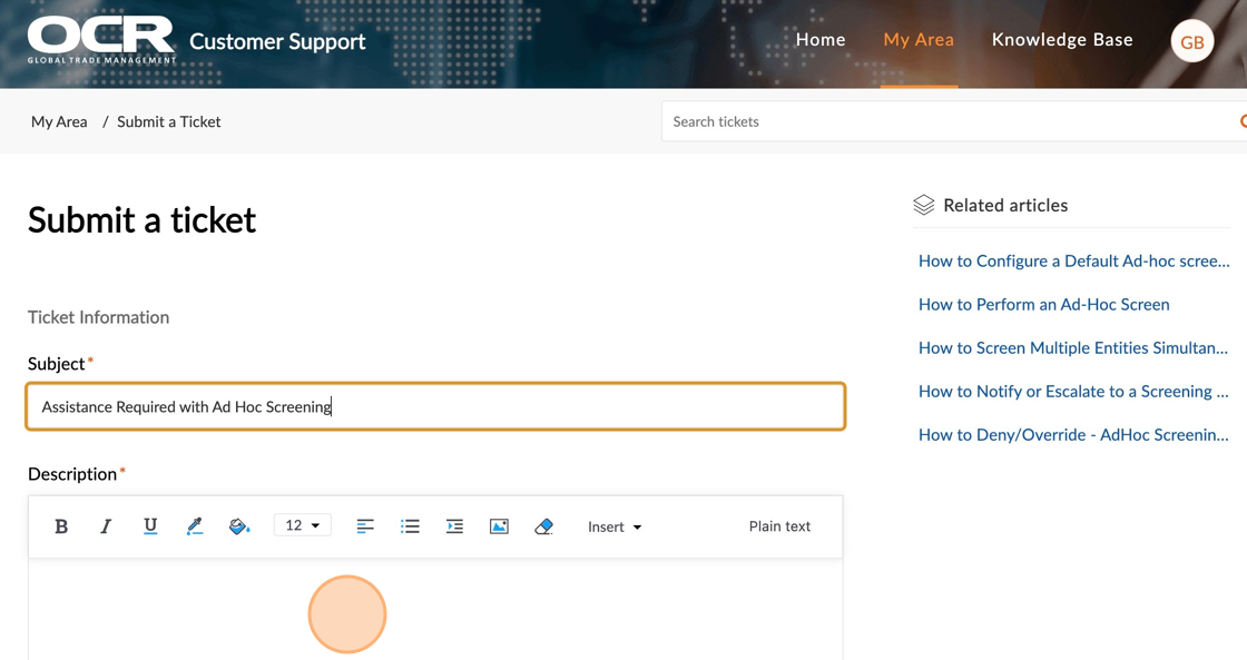 Related knowledge-base articles will automatically appear based on the Ticket's Subject line.