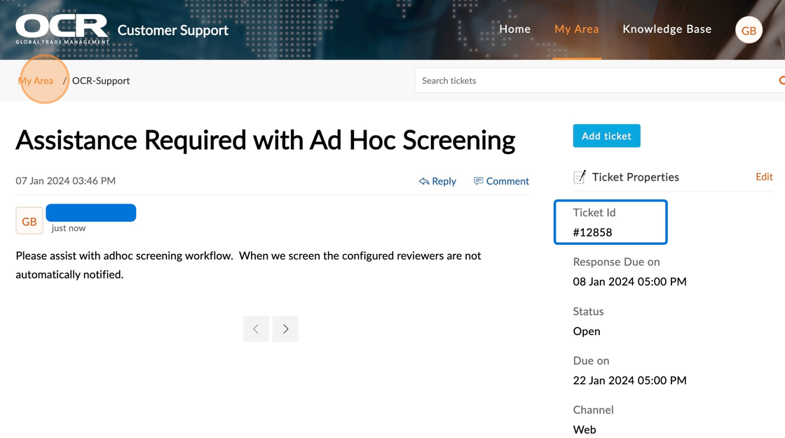 7. Once submitted, a Ticket ID will be generated. Click "My Area" to return to the home page of the customer portal.