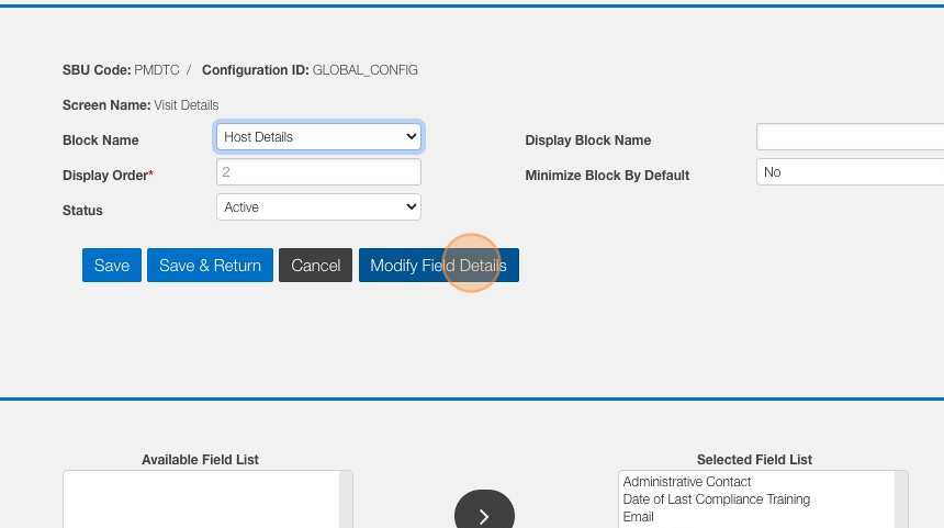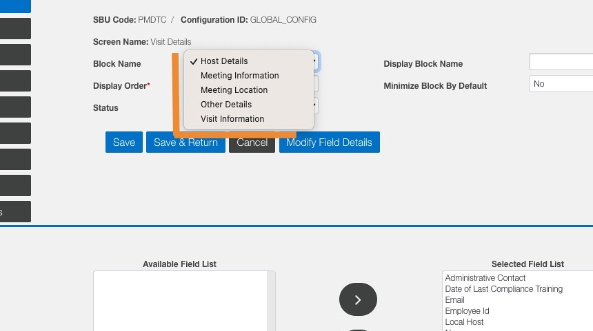 8. Each Screen is organized into a series of Block. Click "Block Name" drop-down to narrow down what field you want to make M/C/O.