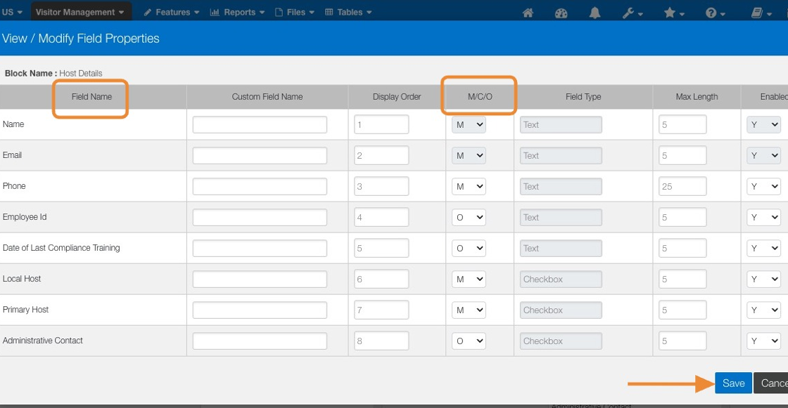 10. Using the M/C/O column, set the desired field to the correct value using its corresponding drop-down and Click "Save"