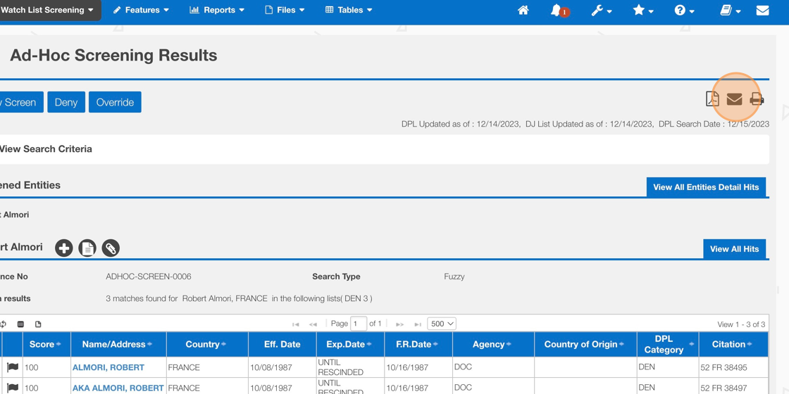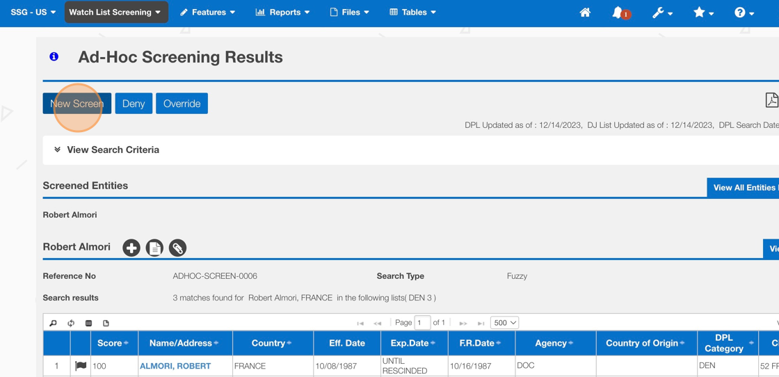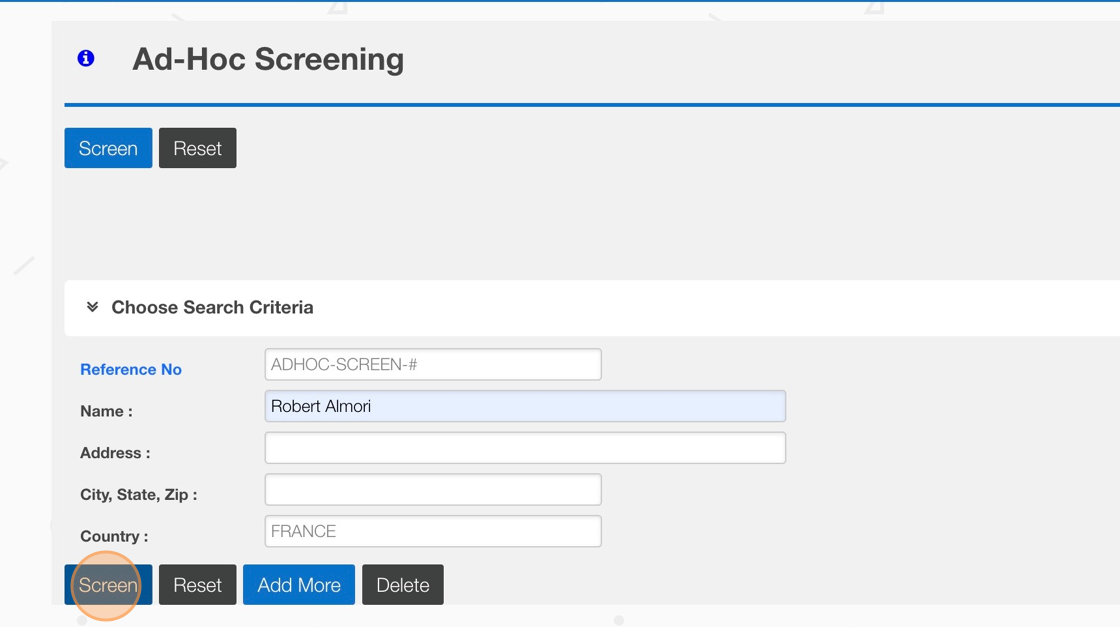1. Complete the entity profile on the Ad Hoc Screening page. Click "Screen"