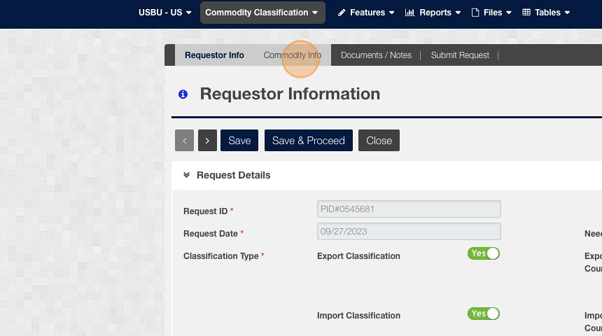 Steps: 1. Navigate to EASE 2. Click "Commodity Classification" 3. Click "Add New Classification Request" 4. Click the "Create New Classification Request" field. 5. Click "Select" 6. Enter the Request ID 7. Click "Save & Proceed" 8. Click "Save & ...